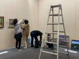 シュミレーションで準備してきたとはいえ、実際に飾り付けてみるとイメージと違ったところもあり、講師の指示のもといくつかの作品をあちらへこちらへと並び変え、より良い展示を目指して頑張りました。